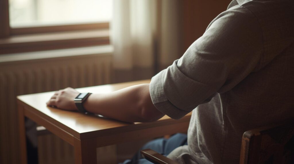 3. 워치를 찬 팔을 테이블 위에 올려서 심장 높이와 같게 맞추기